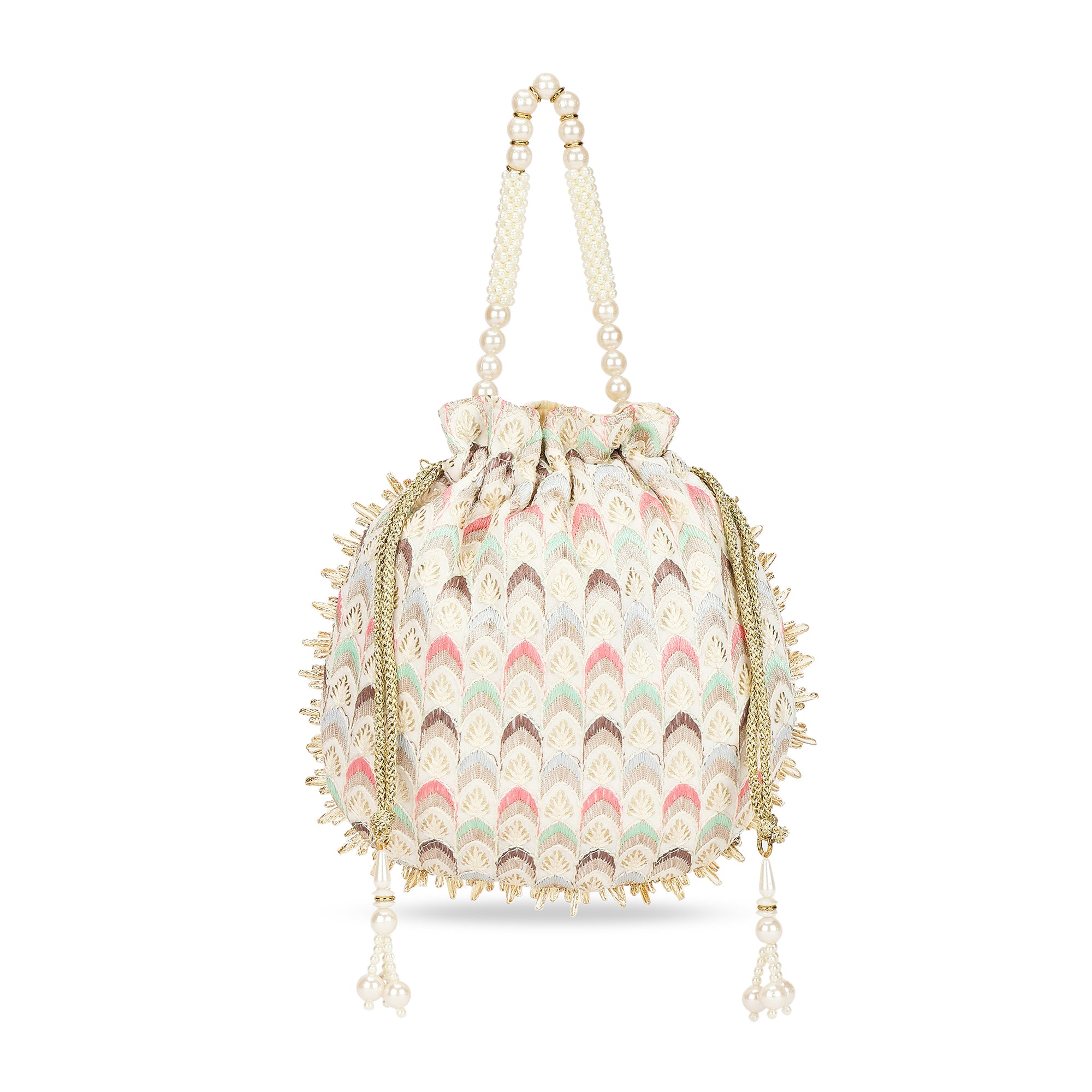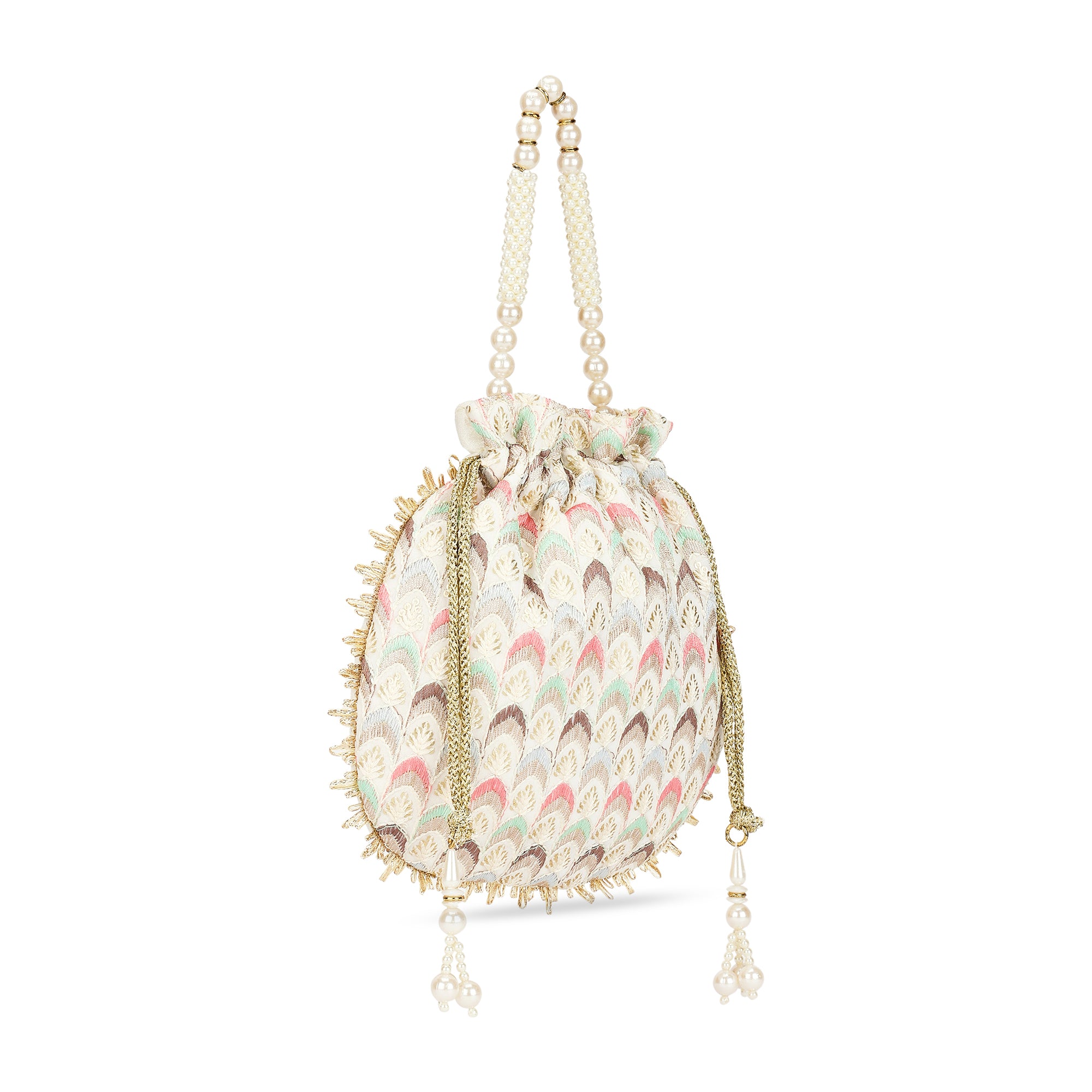 • Special Features: Embriodered Fabric, Branded Lining, Pearl handle, Drawstring Closure, NA.